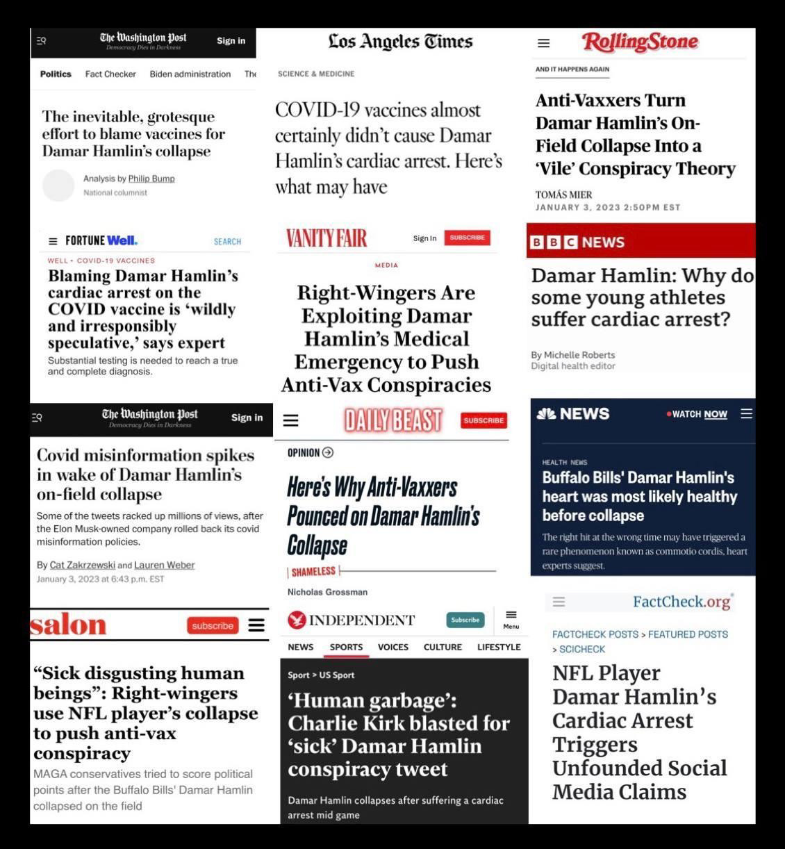💉 Officials released no new information yesterday about Damar Hamlin. Not even a vague explanation of his current condition, the underlying injury, his treatment, or any prognosis. Nada. But corporate media’s psyop team has engaged four-wheel drive and is driving the counter-narrative everywhere.
