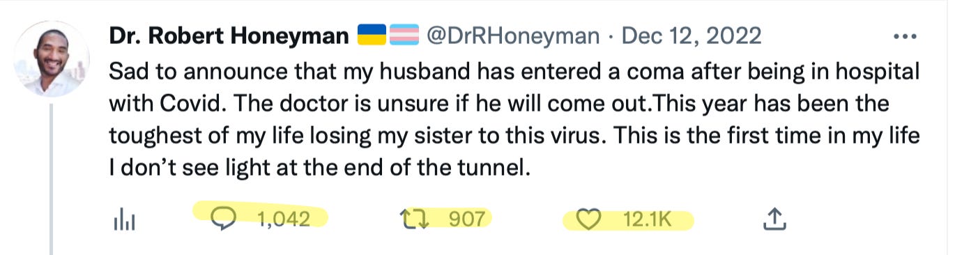 Recently, Dr. Honeypot’s tweets described his difficult pandemic journey; an escalating covid double-tragedy. On November 12th, 2022, Dr. Honeypot, sorry, I mean Honeyman, tragically lost his sister — to covid. Yes. Very Tragic. He wrote emotionally about his loss and received dozens of condolences, over 4,000 retweets and 43,000 likes.