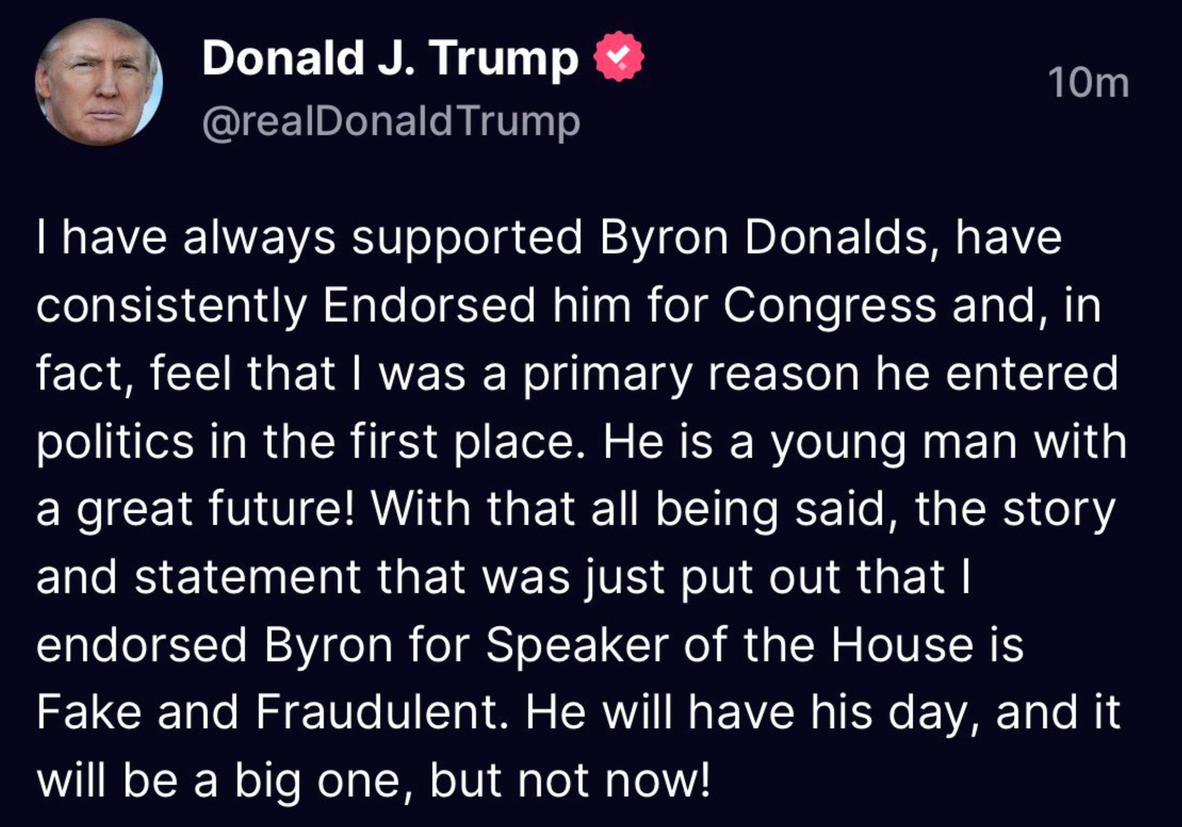 🔥 Trump officially broke with Republican Kevin McCarthy late yesterday afternoon and endorsed Bryon Donalds. At least, that’s what it looked like, while this fake message made the rounds:
