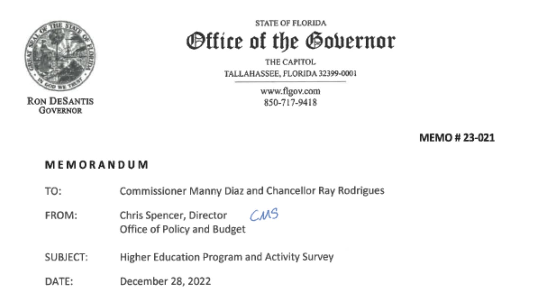 [T]his letter is a request for information from the Department of Education and the State University System regarding the expenditure of state resources on programs and initiatives related to diversity, equity and inclusion, and critical race theory within our state colleges and universities… Please collect and submit all institutions’ responses no later than Friday, January 13, 2023.