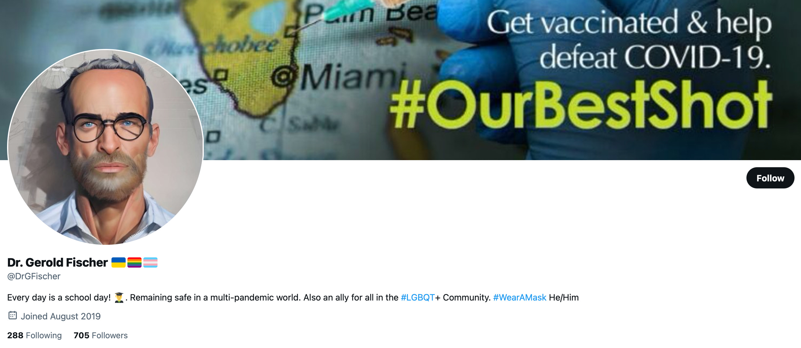 At least two other “Doctor” accounts supported, re-tweeted, and endorsed Dr. Honeyman, helping build his credibility. The first was Dr. Gerold Fischer, another staunch LGBTQ+ ally, now deleted from Twitter. “Fischer,” get it? Fisher. Someone who fishes for something.