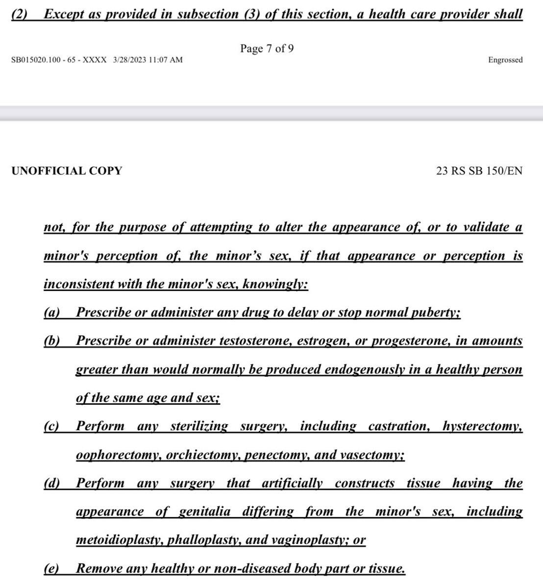 — Bans all treatment of gender dysphoria in kids.