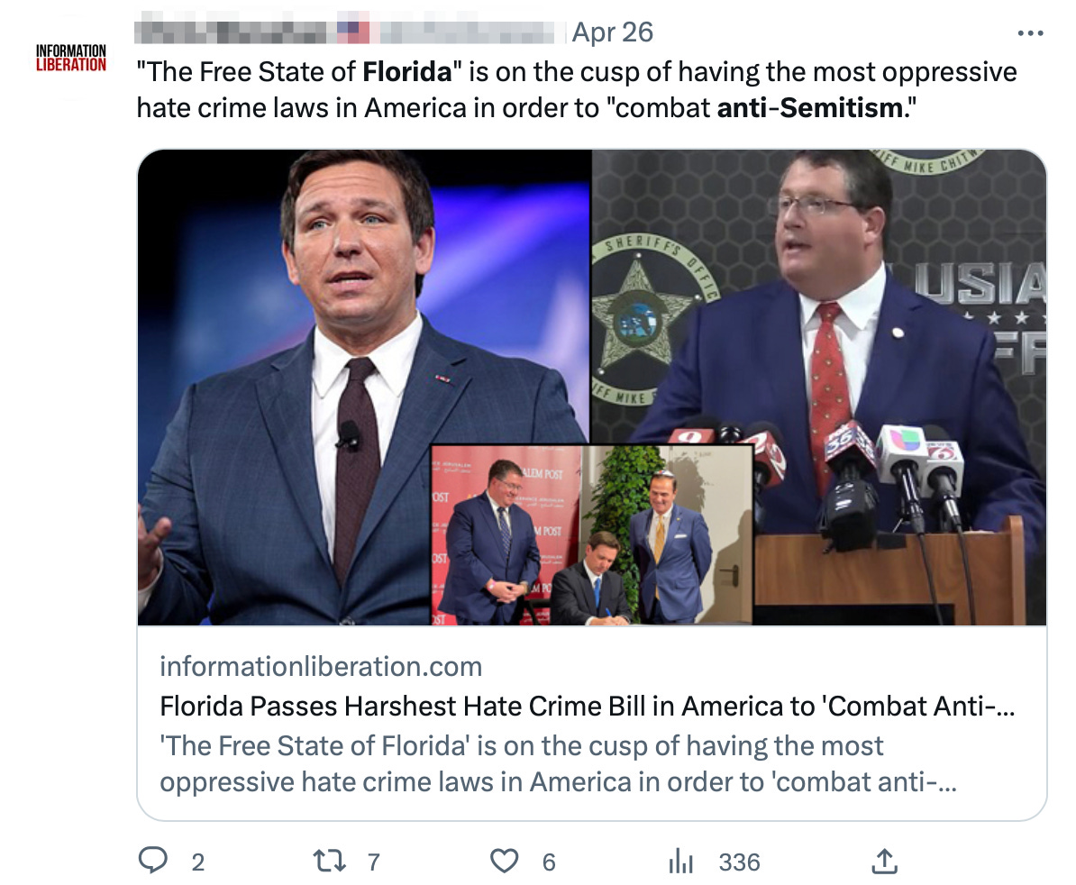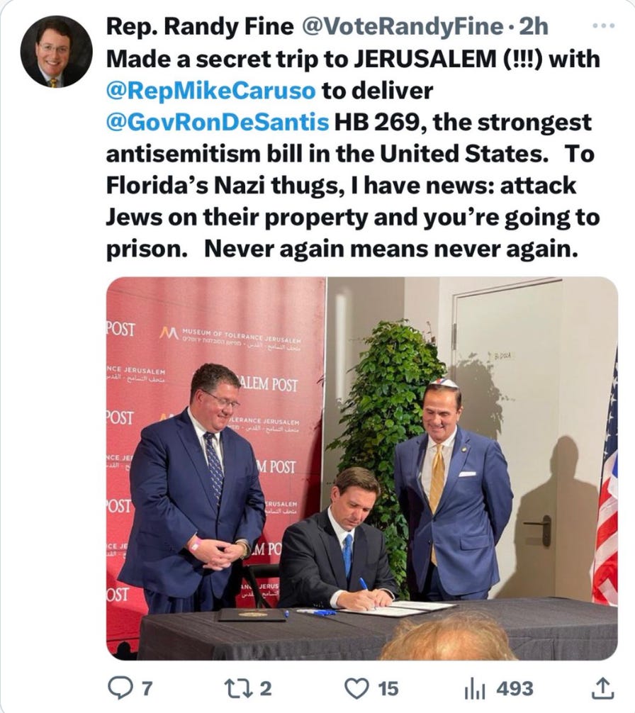 🔥 Several commenters have asked me what I think about the latest controversial Florida bill, a new “hate crime” law, HB 269, that Governor DeSantis recently signed into law while in Israel, where he was obviously courting the Jewish vote. Hot takes are abounding:
