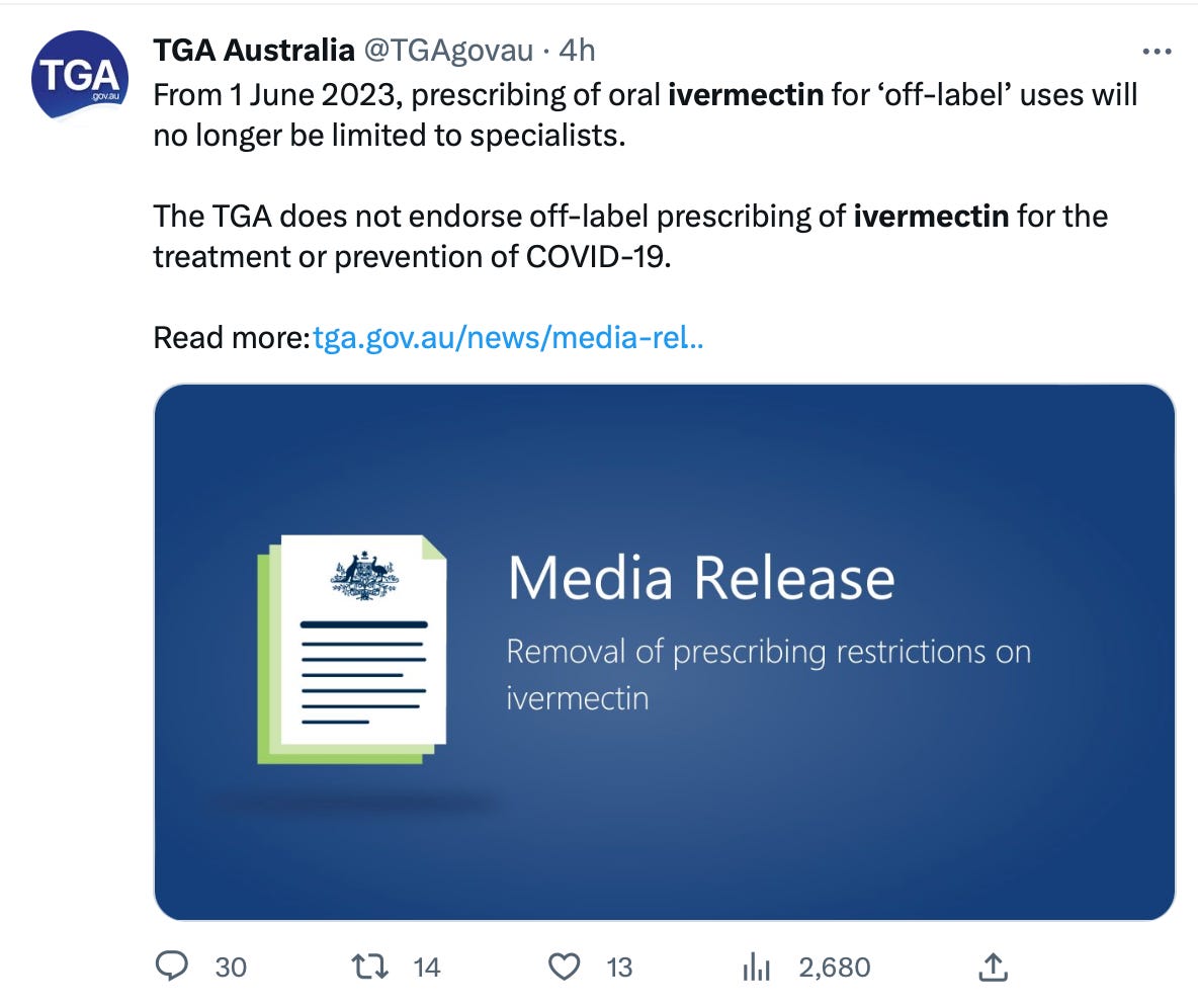 🦘 Yesterday, Australia’s government re-authorized the general prescription of ivermectin, lifting pandemic-era restrictions that confined use of the Nobel-prize-winning drug to dermatologists and a few other highly-specific needs.