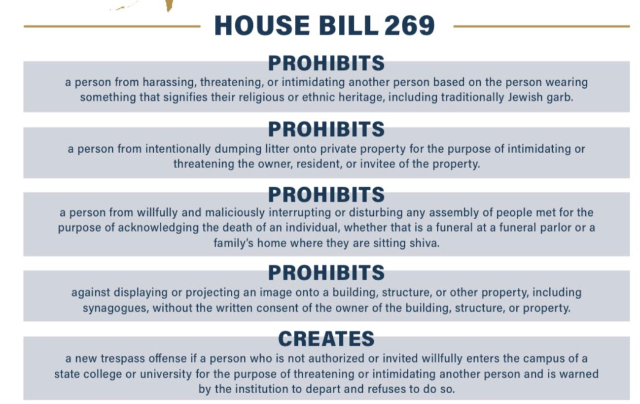I reviewed HB 269. First of all, no words like “jewish,” “synagogue,” or “semitism” (anti- or otherwise) appear anywhere in the bill, even sneakily. The law’s language is very generic. So the summary above is misleading; harassing someone for wearing a yarmulke would be treated the same as harassing them for wearing a cross, both are prohibited. The bill would be better described as enhancing religious protections.