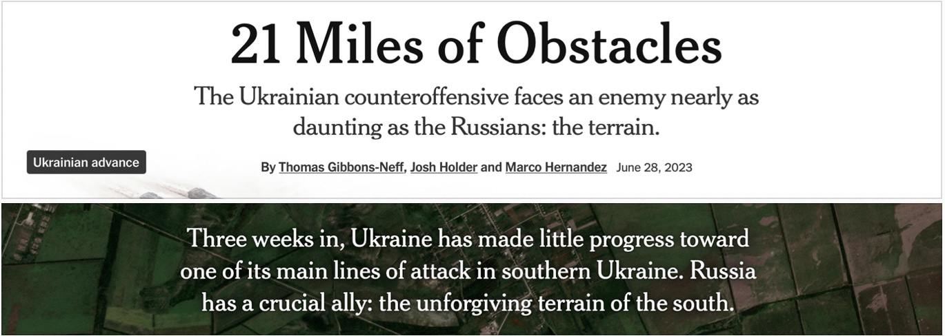 The Times’ article, which is not paywalled, includes a helpful gigantic infographic with a large, scrollable battle map, pointing out all the different ways the devilish Russians have craftily frustrated the brave Ukrainian CounterOffensive™.