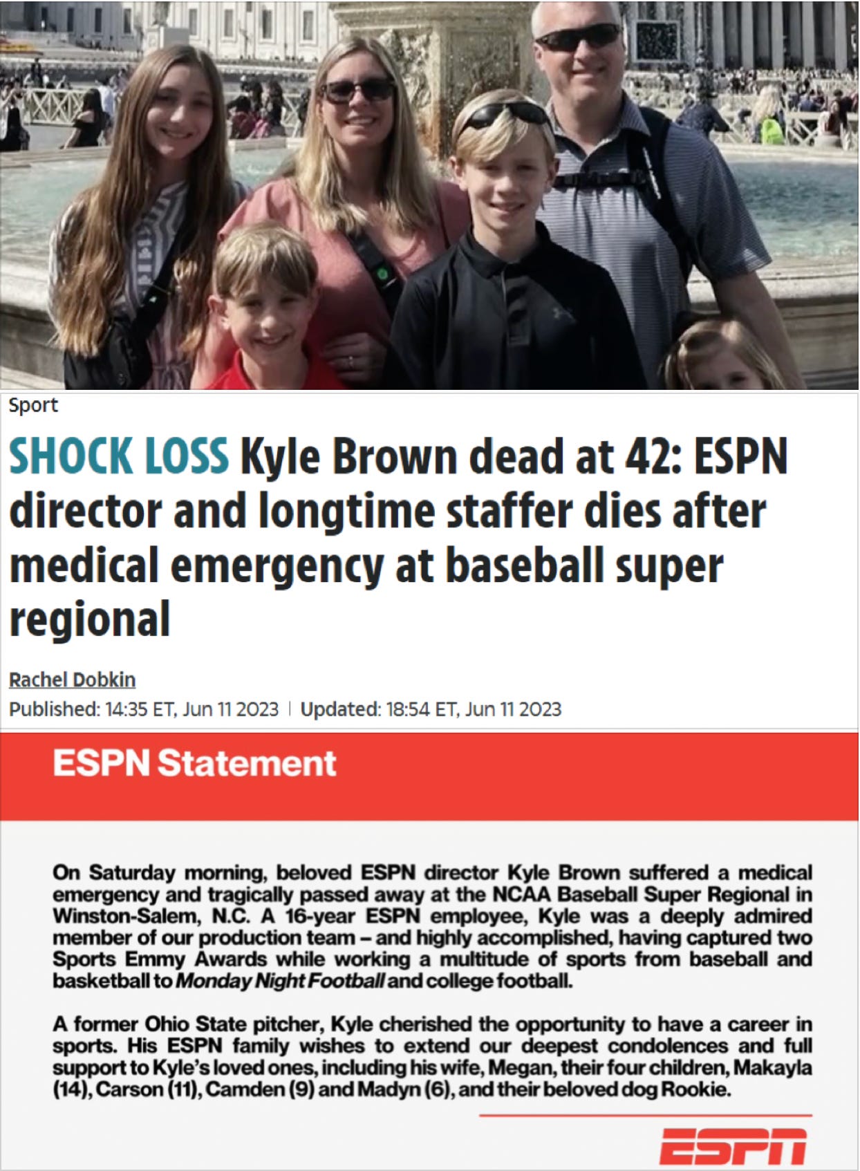 💉 ESPN Sports director Kyle Brown, 42, died suddenly on Saturday June 10th after suddenly suffering a mysterious “medical emergency” at an NCAA baseball super regional in Winston Salem, North Carolina.