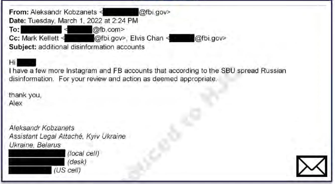 The Committee’s report included a wide variety of the early, pre-purge censorship examples, such as this March 2022 email from Ukrainian “legal attache” Aleksandr Kobzanets, who even HAS HIS OWN FBI.GOV email account: