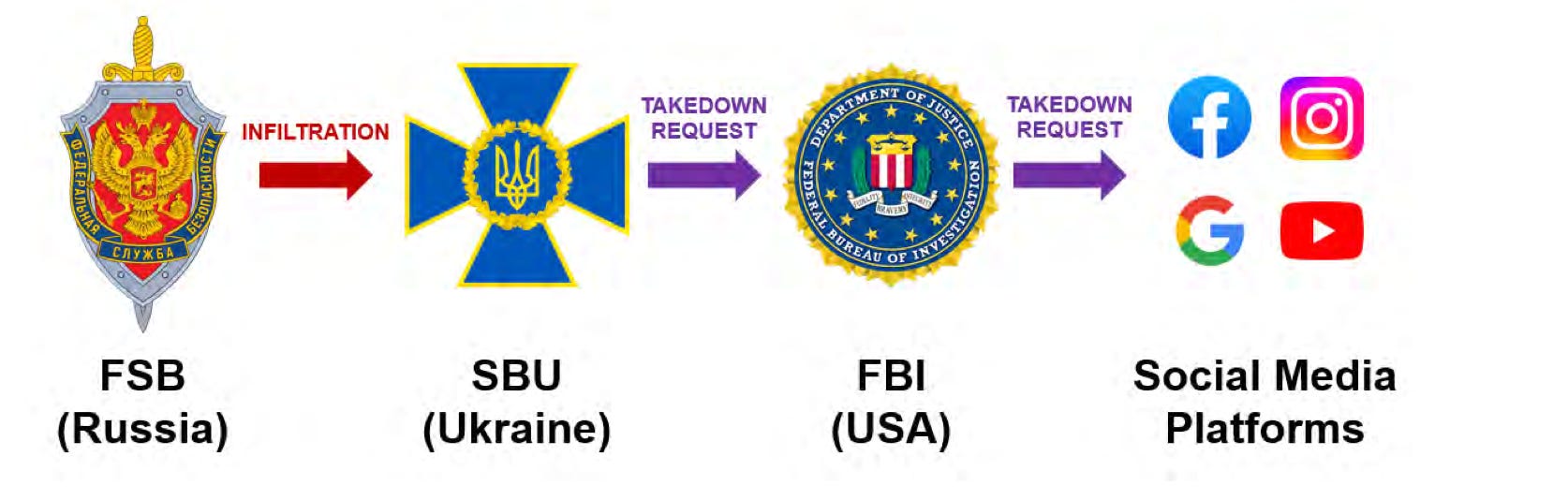 In other words, at the SBU’s request, the FBI flagged for cancellation Americans’ social media accounts, including a verified U.S. State Department account and American journalists’ accounts. Hilariously, in a dark sort of way, the SBU had been infiltrated by Russian agents, and for the first few months many of the takedown requests were for accounts that either supported Ukraine or criticized Russian President Putin.