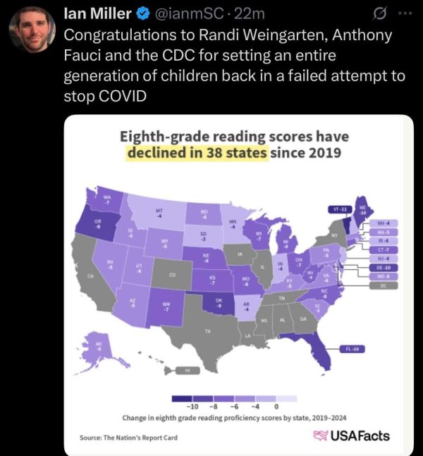 Eighth grade reading scores from 2024 have plunged markedly since 2019. “Experts” are still using COVID as the reason. Florida has done particularly poorly and is among the worst in the nation for declines.