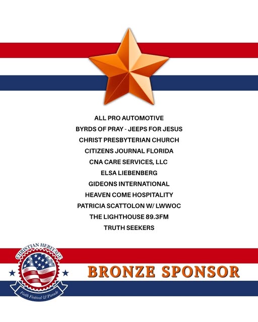 We are incredibly grateful for our Bronze Level Sponsors whose generosity and support are helping make the Christian Heritage Parade & Faith Festival a reality!