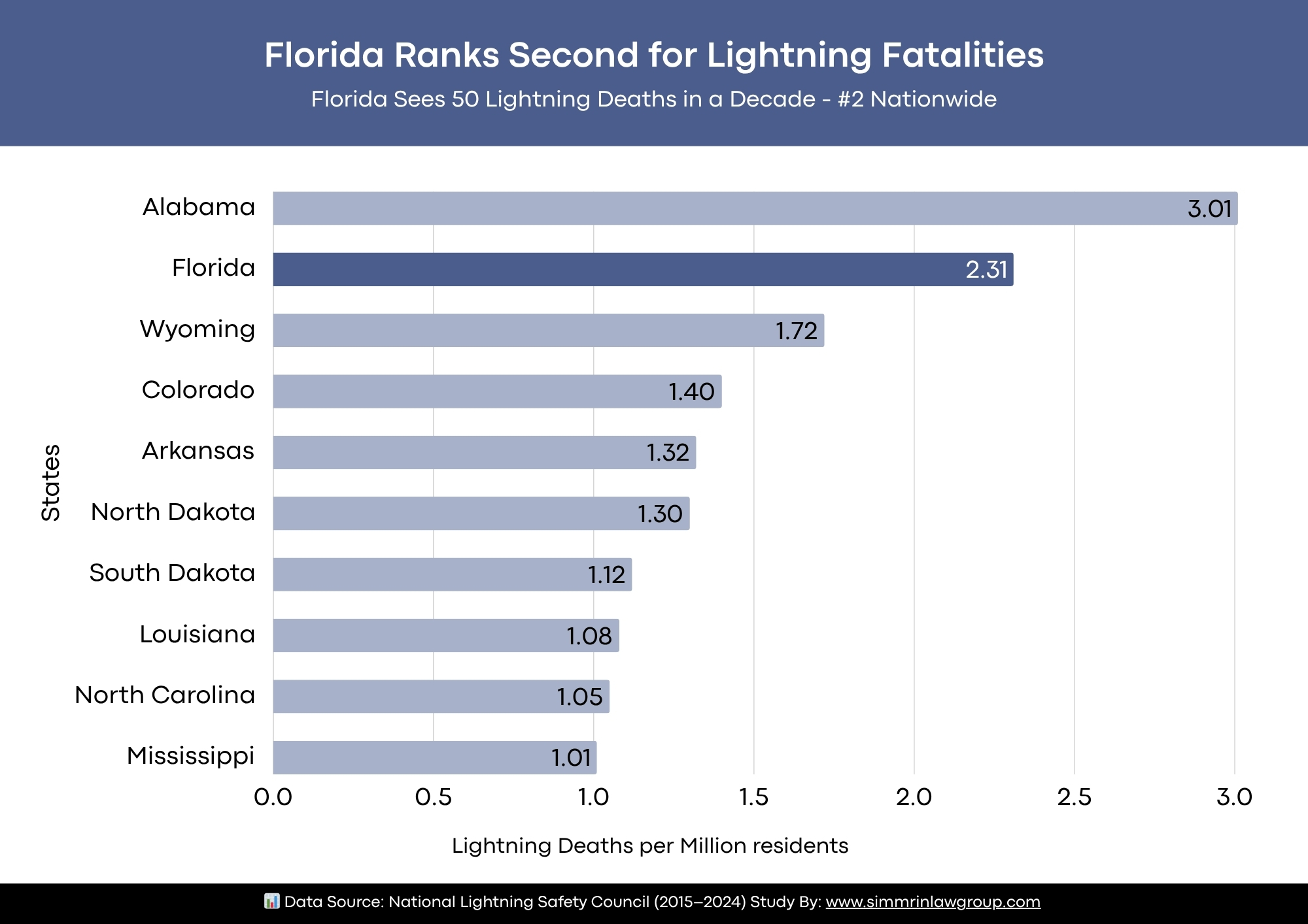 The research, conducted by personal injury law firm Simmrin Law Group, analyzed lightning fatality data from the National Lightning Safety Council across all 50 U.S. states between 2015 and 2024. The total number of lightning deaths per million residents was calculated to determine which states are most affected by lightning fatalities.