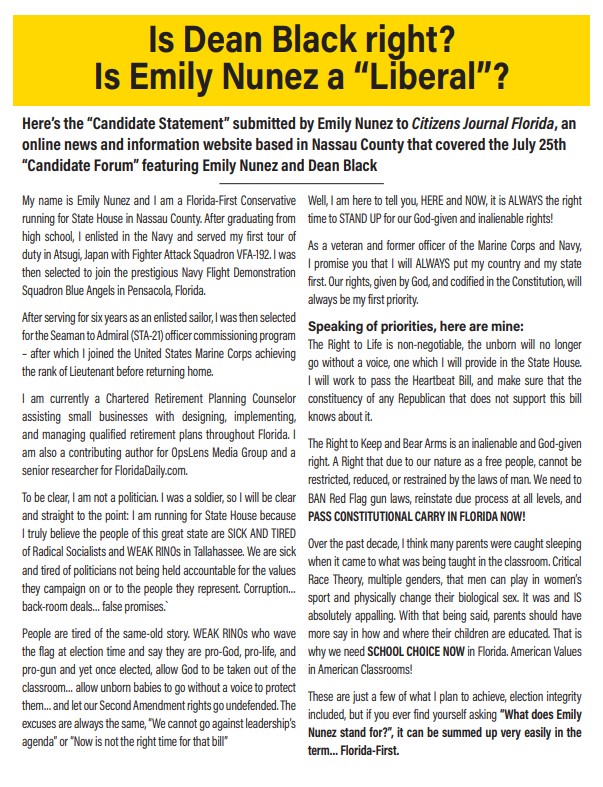 Citizens Journal Florida ran an article during the primary campaign about FL Statehouse 15th District candidate Dean Black (who is also the current Duval County GOP Chair) falsely and personally attacking opponent Emily Nunez. It goes into what was said and the veracity, or lack of it (link below):