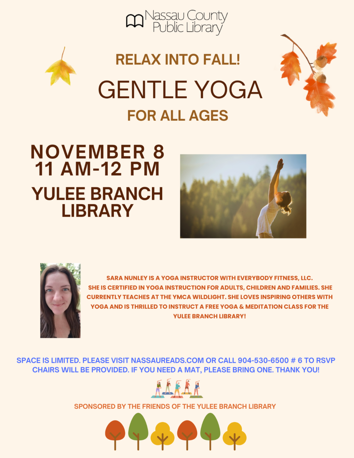 This event is free, however RSVP is required as space is limited. Visit www.nassaureads.com or all (904) 530-6500, Option 6. Chairs will be provided however please bring your own mat if you require one.