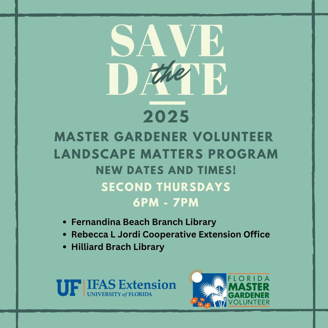 The Nassau County Extension Office has announced that their monthly Landscape Matters Classes are being moved to the 2nd Thursdays from 6:00-7:00 p.m. This is in response to requests from the community to make some of these classes available in the evenings. Thanks to the Nassau County Public Library System, the Extension Office can continue their rotation of programs around Nassau County.