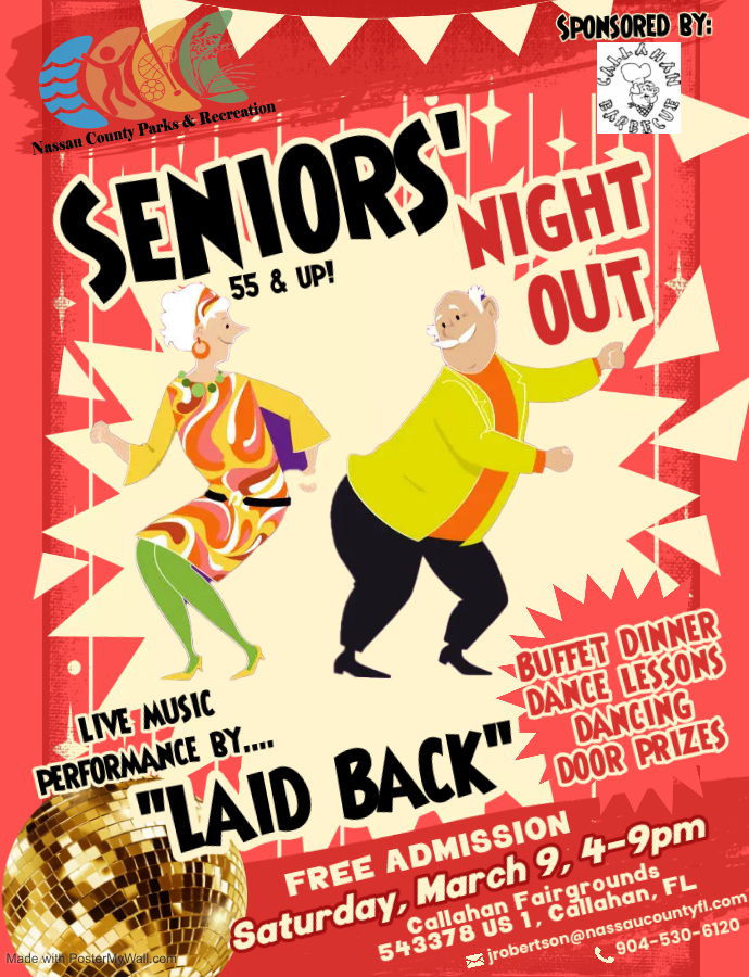 We are excited to announce that we will offer a free “Seniors’ Night Out” for people in the community who are 55 and older on Saturday, March 9th from 4-9pm at the Callahan Multi-use Facility and outside courtyard of the Callahan Fairgrounds.