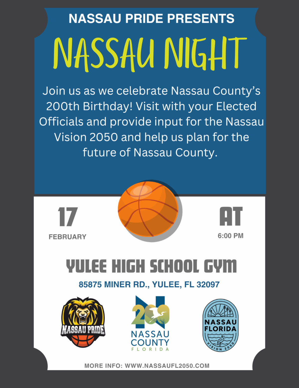 Enjoy a game of professional basketball, meet some Elected Officials, and provide input for Nassau Vision 2050 to help us plan for the future of Nassau County!