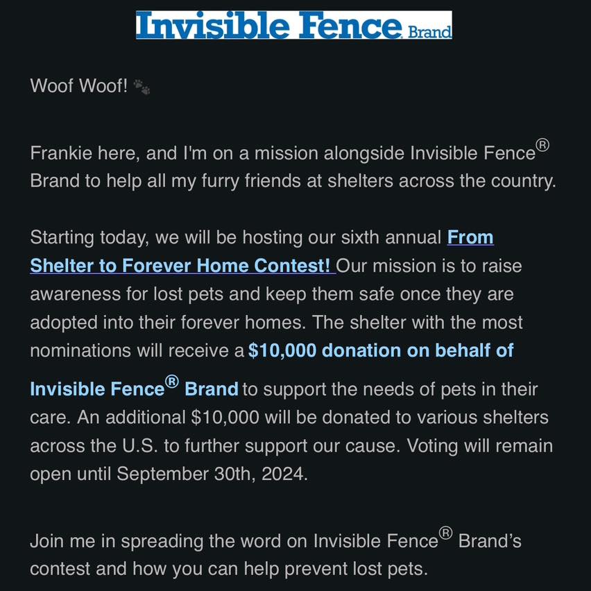 Help Nassau County Animal Services win a $10,000 grand prize in the Invisible Fence Brand contest! This is an incredible opportunity to raise awareness about lost pets and ensure they remain safe once they find their forever homes. By voting for your favorite animal shelter, you’re not just casting a vote—you’re championing the cause of countless animals in need. Spread the word far and wide to your friends, family, and fellow animal lovers! Together, we can make a significant difference in the lives of these deserving pets. Let’s rally together and nominate Nassau County Animal Services for this amazing contest—every vote counts!