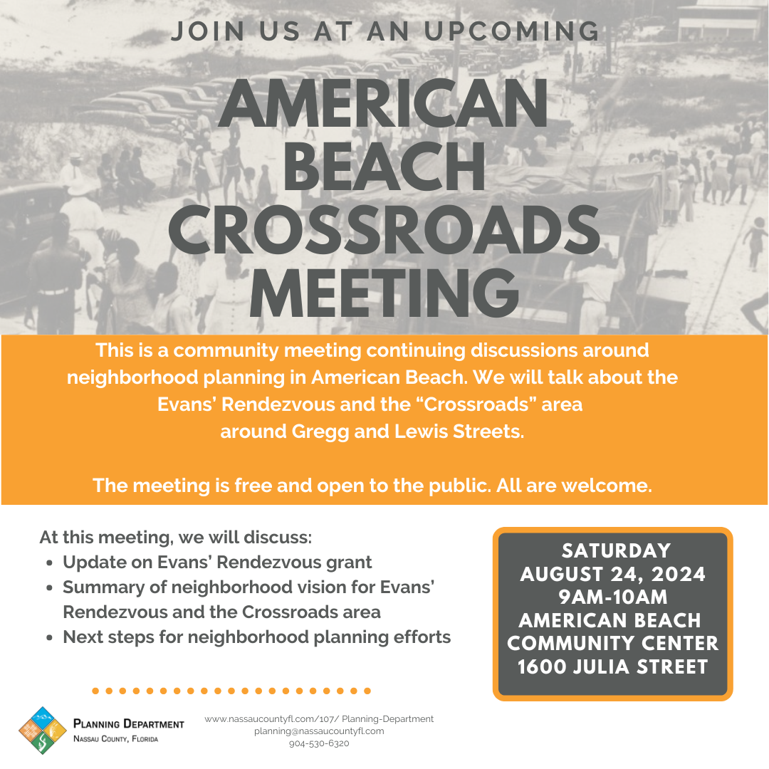 The Nassau County Planning Department will hold its next American Beach Beach Community Planning Meeting on Saturday, August 24, 2024 from 9am-10am at the American Beach Community Center. This event, “American Beach Crossroads”, will focus on discussions around neighborhood planning at American Beach, specifically the “crossroads” area around Gregg and Lewis Streets. Other topics include: