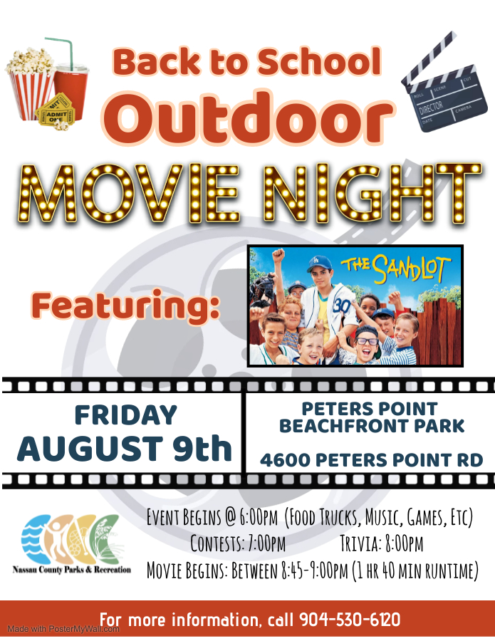 Bring a chair or blanket and enjoy the movie from our big screen or enjoy from your vehicle. If you have any questions, please contact Nassau County Parks & Recreation at (904) 530-6120 or email [email protected].