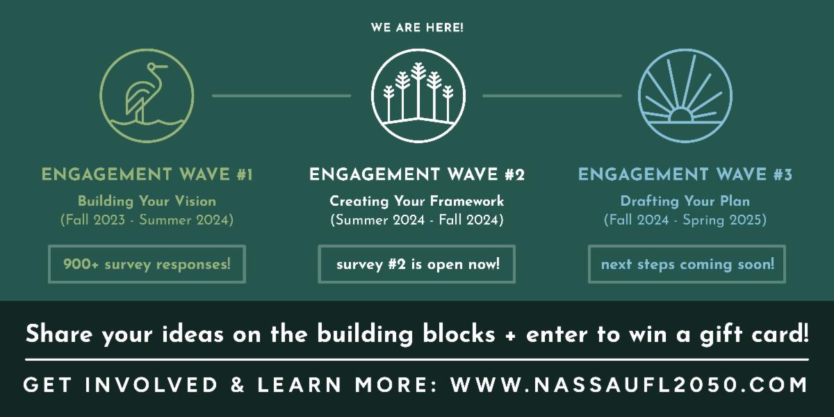 Nassau County is building a vision for the future, and we need YOUR input! Over thousands of voices shared their hopes for Nassau’s future. Take the quick second survey to share your ideas on the community’s DRAFT “Community Building Blocks” – these core values will guide recommendations and strategies for the Nassau Florida Vision 2050 plan. These draft Building Blocks were created by synthesizing: the community’s voice and a recognition of future needs following an analysis of existing conditions.