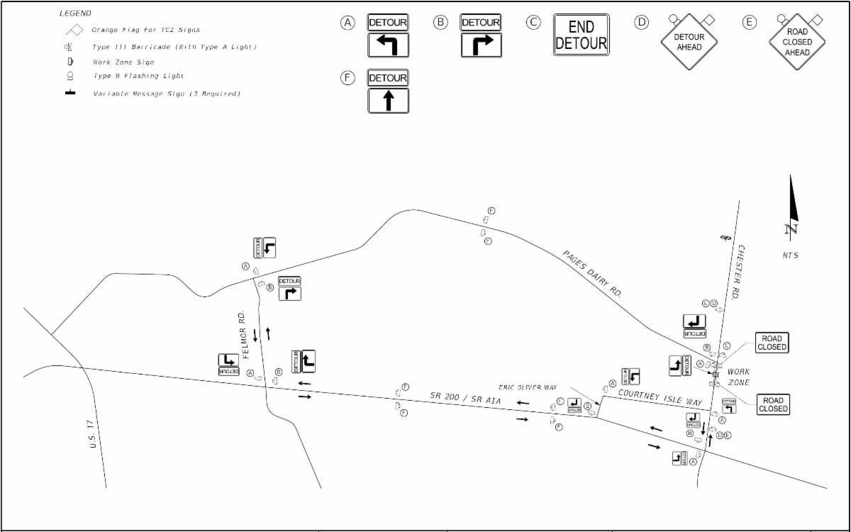 Traffic will be maintained in accordance with FDOT design standards throughout the project. During the reconstruction there will be a detour via Pages Dairy Road to Felmor Road to SR 200 / A1A. During the reconstruction Chester Road will be closed to complete work, as shown below: