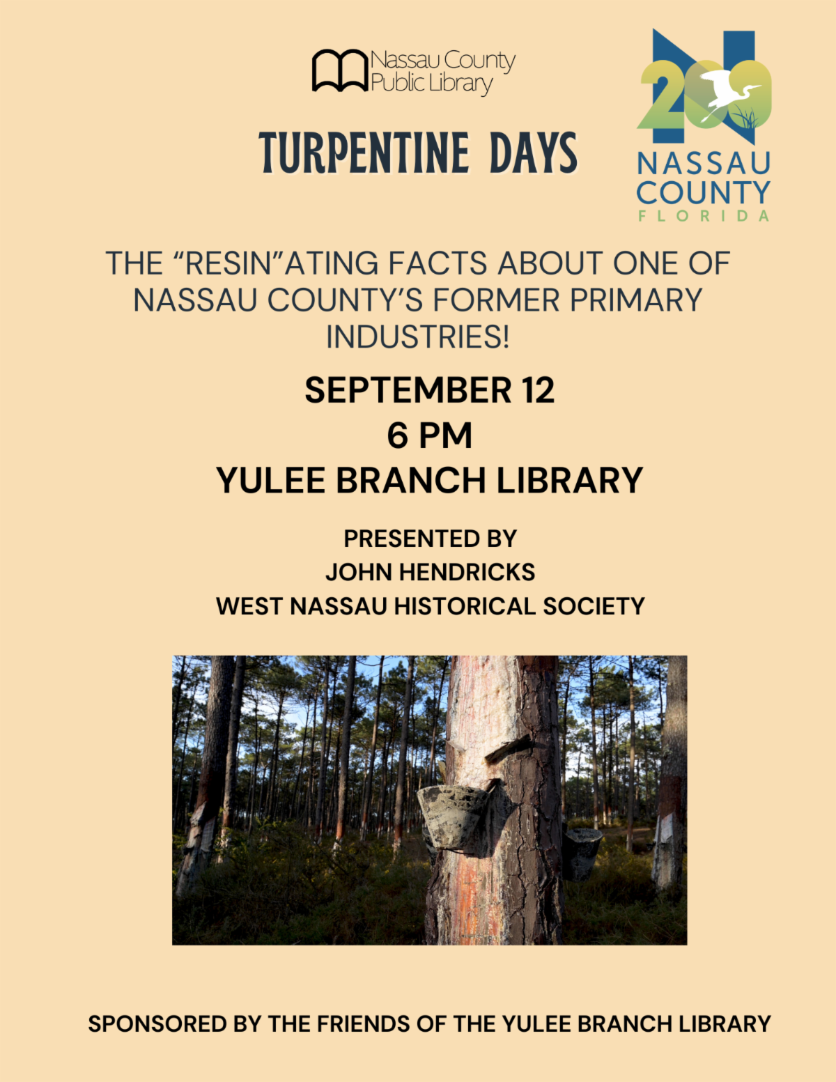 In celebration of Nassau County’s 200th birthday, the Nassau County Public Library System is hosting a special program, Turpentine Days. Led by local historian John Hendricks of the West Nassau Historical Society, this event will include discussions on one of Nassau County’s first industries, turpentine production, and the economic and social impact the industry had on the development of Nassau County.