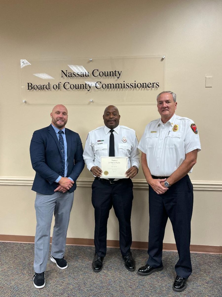 Nassau County Fire Chief Brady added, “Dale Green is one of our Engineers. He drives ladder 20 at Station 20 (south Amelia Island). He’s been married to his life Leoni for 29 years, has two children, and he enjoys coaching basketball. We appreciate his years of service and wish him the best.”