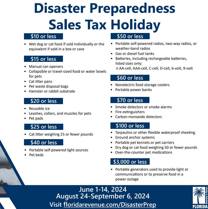 Mark your calendars! The second 2024 Florida Disaster Preparedness Sales Tax Holiday is set for Aug. 24-Sept. 6. During Disaster Preparedness Sales Tax Holidays, you may purchase qualifying items exempt from sales tax.