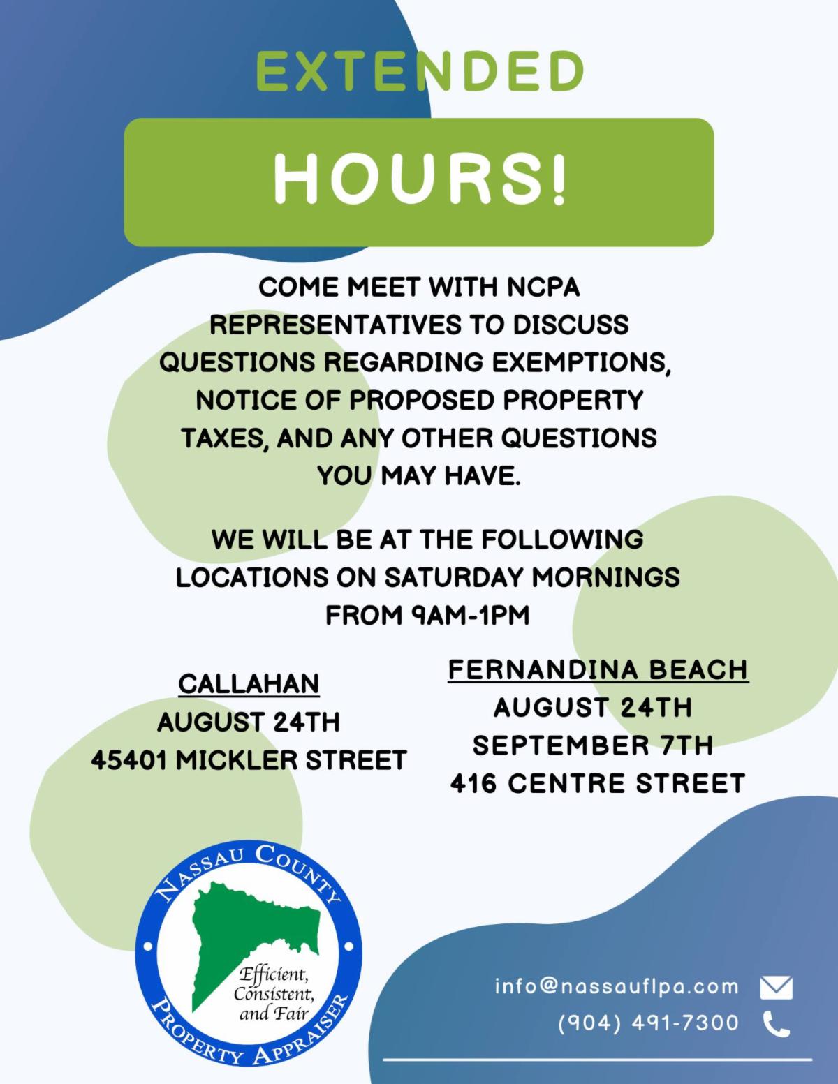 The Property Appraiser is offering extended hours for you to come in and ask your questions in person, outside of the normal work week. See flyer for details!