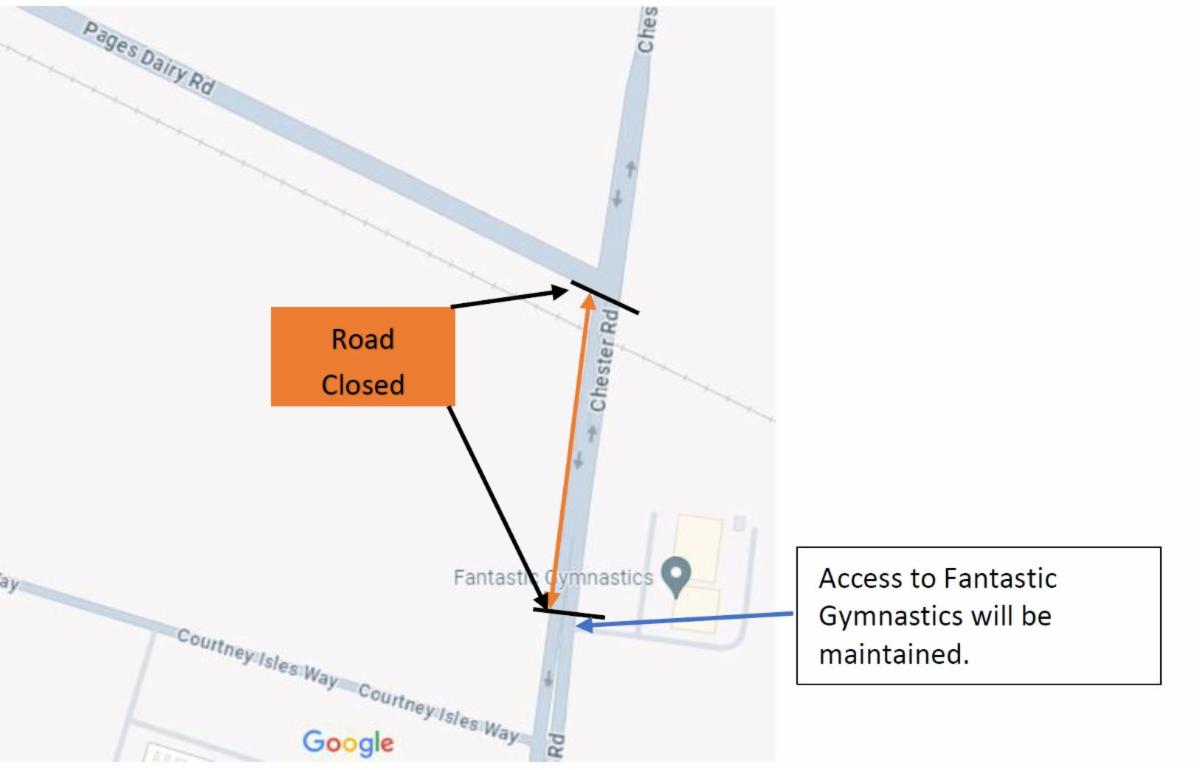 The Nassau County Engineering Department is reconstructing Chester Road and Pages Dairy Road including the railroad crossing on Chester Road. The railroad crossing section of reconstruction will be from Pages Dairy Road intersection at the Railroad crossing to the entrance of Fantastic Gymnastics. Work is expected to start on Sept 5th with railroad crossing reconstruction, weather and unforeseen circumstances permitting. Completion of the reconstruction is expected to take 5 days, potentially including night activities, weather and unforeseen circumstances permitting.
