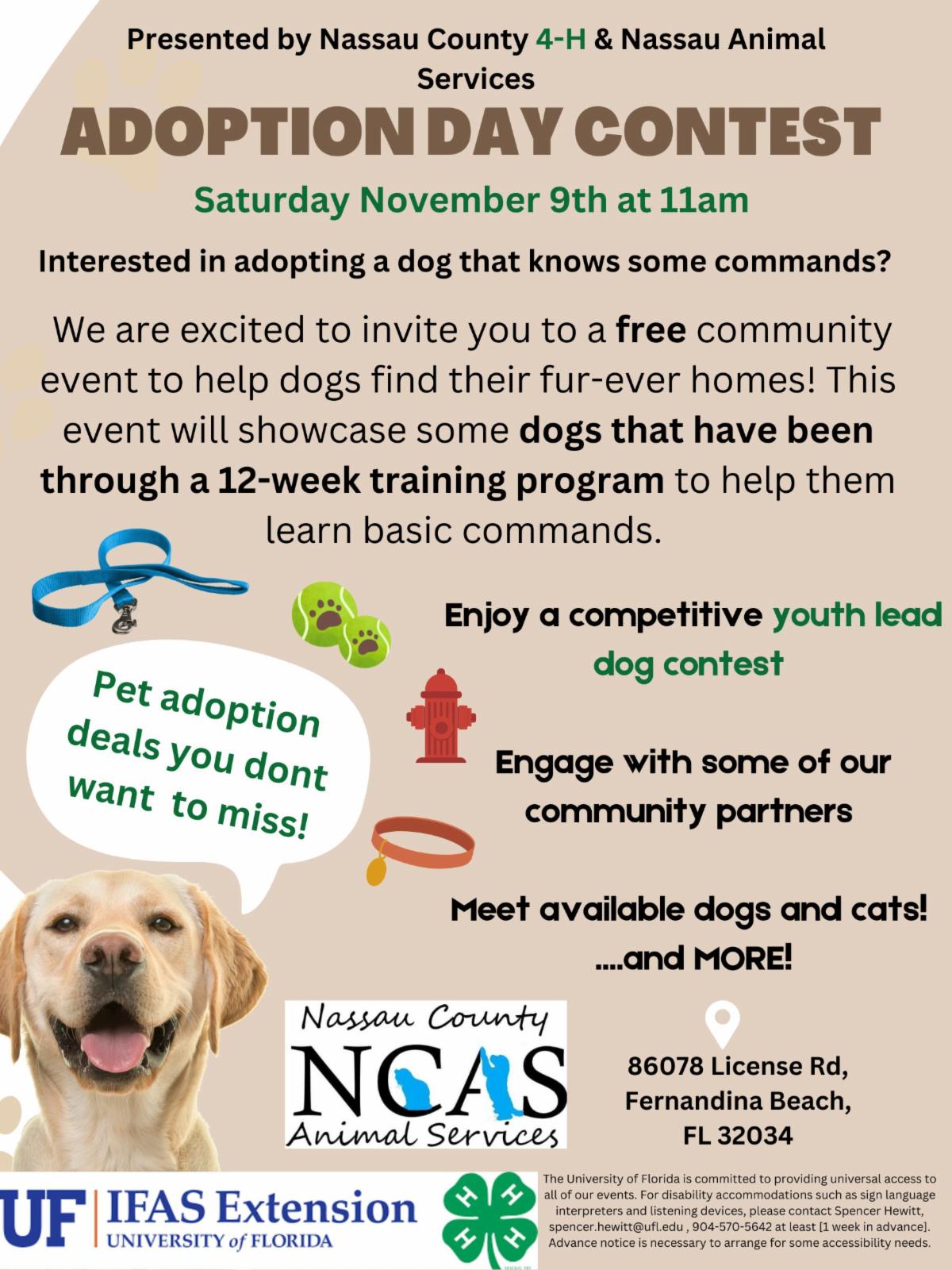 In July 2024, we announced that Nassau County Animal Services and the Nassau County Extension Office partnered to offer “The Dog Program”, a course designed to educate teens ages 15-18 on basic dog training and caring skills. For the last day of the program, the youth will host a 4-H Adoption Day Contest at Animal Services on November 9, 2024 from 11am-2pm. This free community event will feature tables with information from our community partners, a live contest for you in the program, and pets available for adoption.