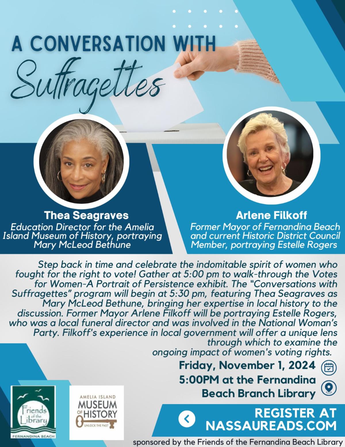 The Fernandina Beach Library is hosting A Conversation With Suffragettes. This program will feature resident Thea Seagraves as Mary McLeod Bethune, who will provide expertise in local history, and resident Arlene Filkoff as Estelle Rogers, a local funeral director who was involved in the National Women’s Party. Through this event, you will examine the ongoing impact of women’s voting rights.