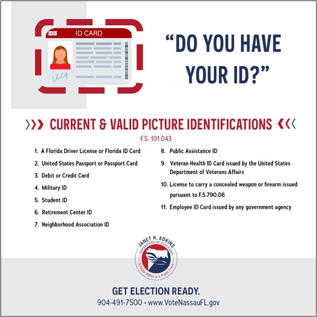| Early voting for the General Election began on October 23, 2024. The Supervisor of Elections Office reminds you that a voter information card cannot be used as a form of ID when you vote. When voting in person, you must have a valid photo and signature ID from the list below. The SOE also suggests that you review the sample ballot in advance and mark it. Sample ballots call also be viewed on our website at www.votenassaufl.gov/sample-ballot. |