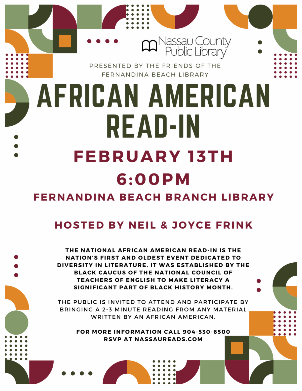 In recognition of Black History Month, the Fernandina Beach Library will host their annual African American Read-In on Tuesday, February 13, 2024 at 6:00 p.m. The program will be hosted by residents Neil and Joyce Frink.