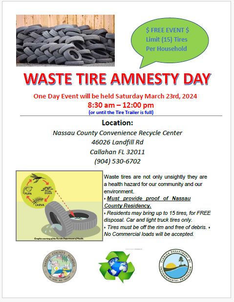 Nassau County Solid Waste will host their next Waste Tire Amnesty Day on Saturday, March 23, 2024 at the Convenience Recycle Center located at 46026 Landfill Road in Callahan.