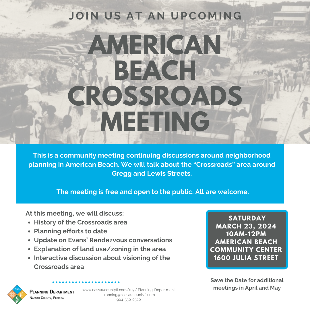 The Nassau County Planning Department will hold its next American Beach community planning meeting on Saturday, March 23, 2024 from 10am-12pm at the American Beach Community Center. This event, “American Beach Crossroads”, will focus on discussions around neighborhood planning at American Beach, specifically the “crossroads” area around Gregg and Lewis Streets. Other topics include: