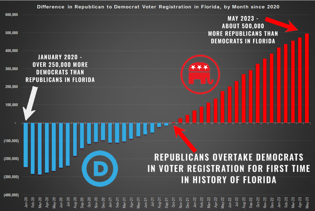 As of May 31, 2023, Republicans held a 496,150 voter registration advantage over Democrats in Florida. Based on these trends, it’s safe to say that as of today there are more than 500,000 registered Republicans than Democrats in Florida!