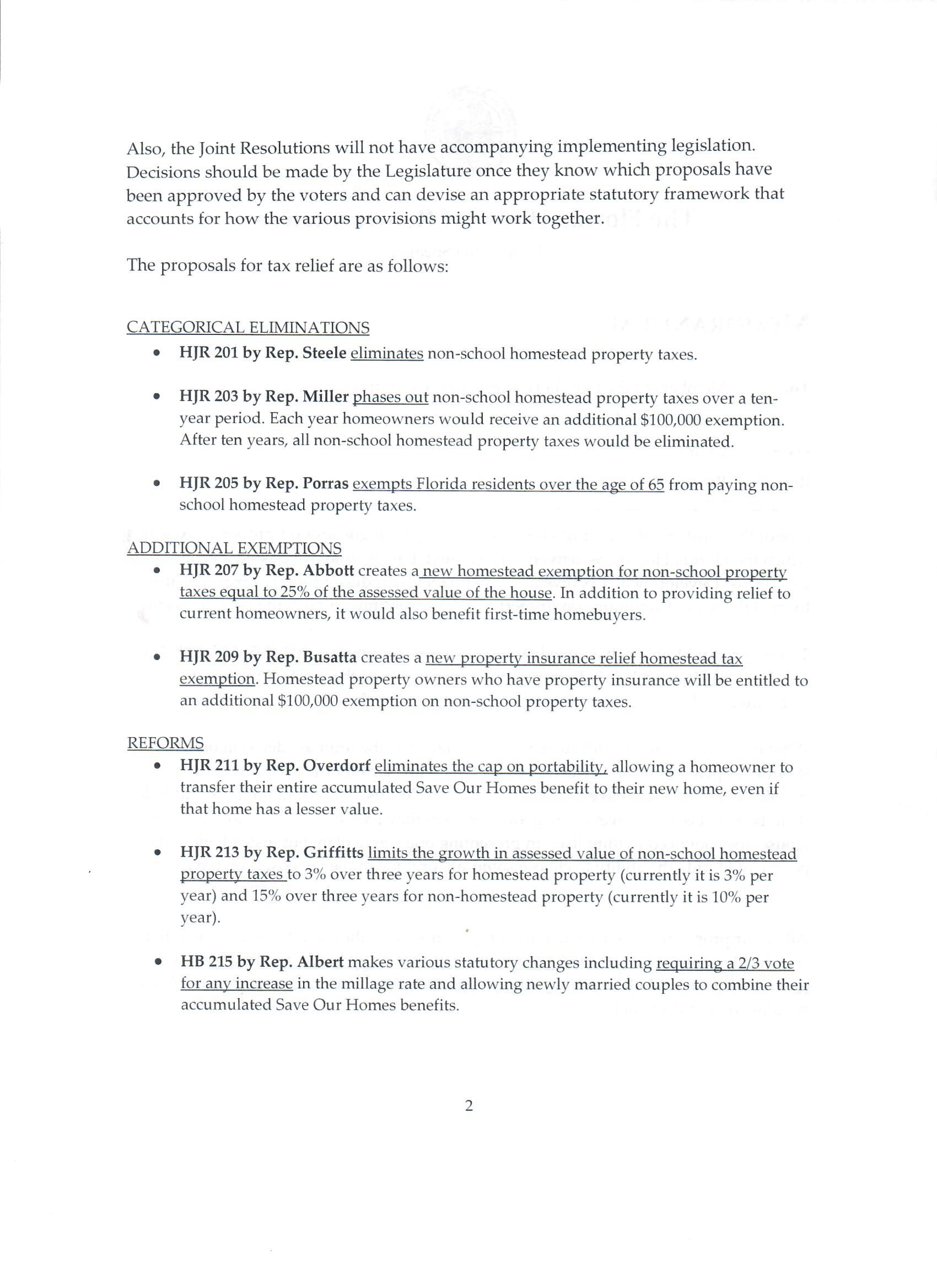 One of the hottest topics discussed Monday evening was the Governor’s proposed elimination of residential property taxes. In response the various questions raised by the audience, our representatives gave us a great handout: a Memorandum from the Florida House Speaker, Daniel Perez, which identifies various proposals that have been presented by the Florida House Select Committee on Property Taxes. The 2-page hand-out is included immediately below for your review: